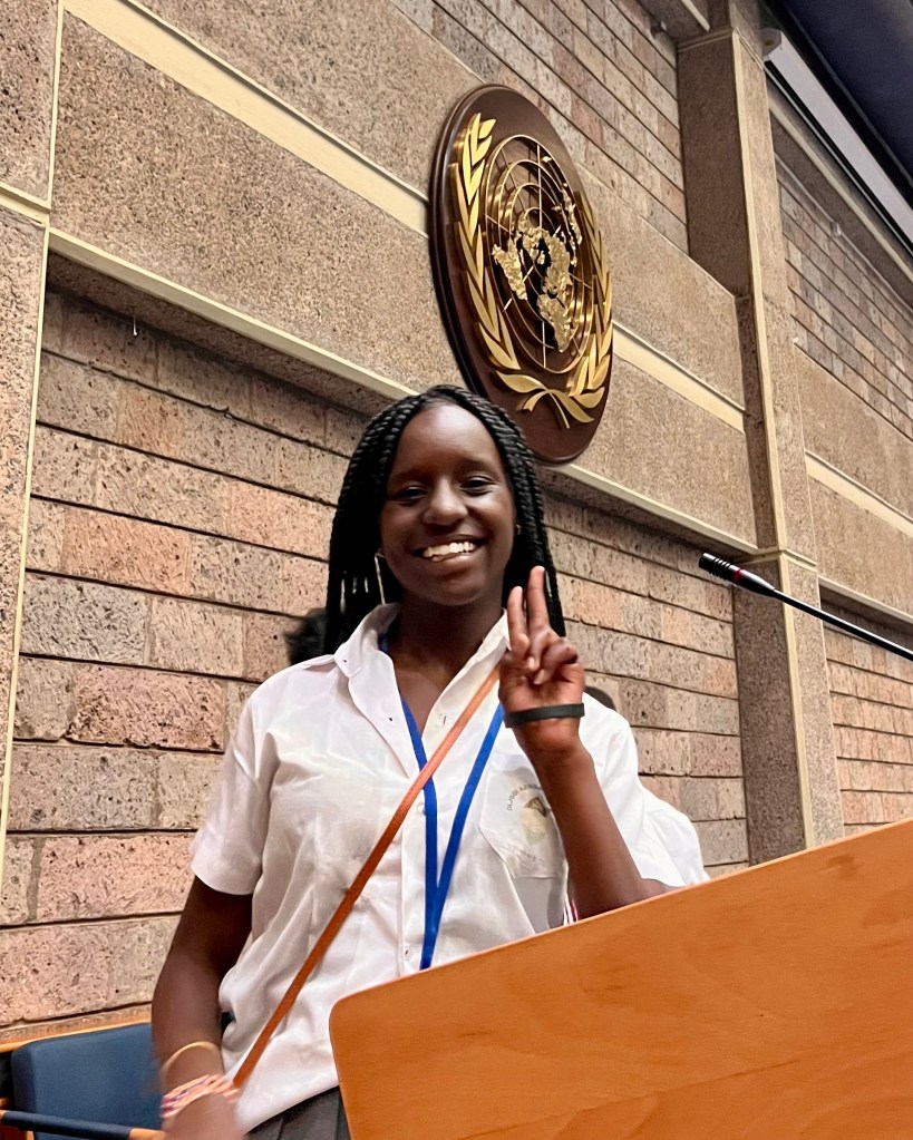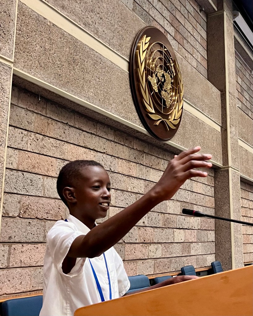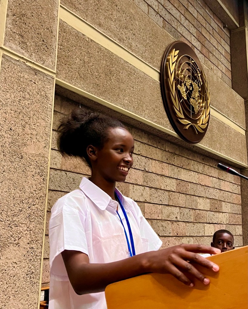 On that day I was very excited to go to Nairobi.I remember when we prepared pasta: me, you and Beatrice on that day that we arrived at Nairobi. On the next day I learnt a lot at UNEP, like if there is something wrong in any country, they stay together to solve the problem at UNEP. I remember when Alexander asked me “how many flags do you know in the world?”, I said I can name twenty flags, and Alexander promised me an Oreo and I named twenty-seven flags and I got an Oreo. That was my happy day in Nairobi.